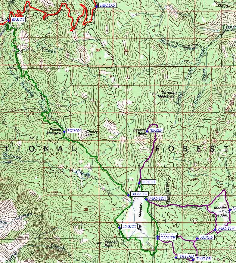 If you're headed to Big Meadow (half-day hikes to Taylor Dome and Sirretta from here, a full day hike to Rockhouse), take the Sherman Pass road to the Big Meadow turnoff (waypoint BIGJCT), then go south past Poison Meadow (waypoint POISON) and Horse Meadow. Part of the road is dirt, but regular passenger cars can drive it without any problems (as of 2005). It's 12 miles from Sherman Pass Road to Big Meadow, mostly uphill.