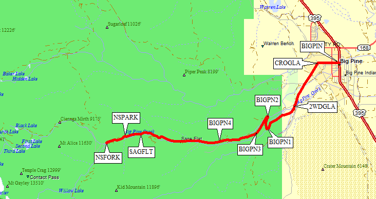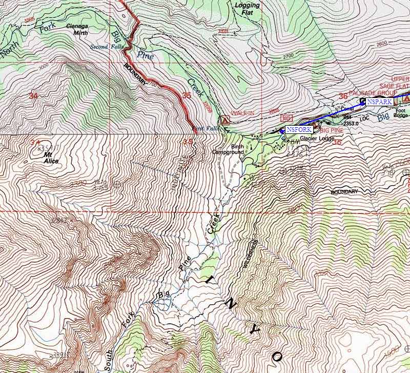 For the North Fork and South Fork trails, just take the Glacier Lodge Road (aka West Crocker Rd) west from the center of Big Pine (waypoint BIGPIN). (The Red Lake and Birch Lake trailheads are accessed via McMurry Meadow road, a turn south off Glacier Lodge Road at waypoint 2WDGLA.)