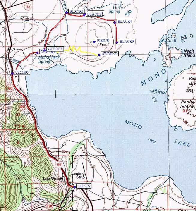 From the junction of Highway 395 and Highway 120 near Lee Vining (waypoint LEEVIN), go north 4.3 miles. Turn at the clearly marked right hand turnoff for well-paved Cemetery Road (waypoint CEM395), shown in red on the map below. Pass the old boneyard in about a half mile (waypoint CEMTRY), and then the road becomes unpaved but graded.