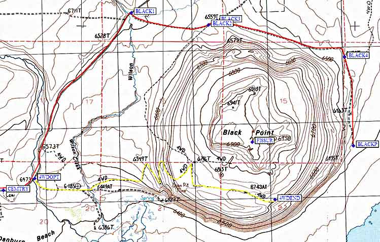 Go straight at the first junction with a private road to the right (waypoint 4WDOPT, see note below about possible shortcut). After driving 3.7 miles from Hwy 395 on Cemetery Road, take a poorly marked right turn onto an unnamed dirt road to Black Point (waypoint BLACK1). After driving 2.6 miles on the unnamed road, going by a couple of small junctions (waypoints BLACK2-BLACK4), the road dead-ends at a parking lot with some interpretive signs (waypoint BLACKP).
