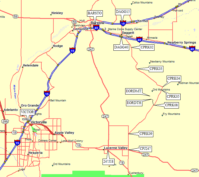 NOTE: I only drove the northern approach (GPS Route EAST ORD NORTH) from Barstow, but the waypoint file also includes waypoints for the southern approach (GPS Route EAST ORD SOUTH) from Victorville. If you use the Victorville approach, please contact me to confirm the waypoints are correct! I think the best route is to exit I-15 on Hwy 18 in Victorville, follow Hwy 18 east to Hwy 247, then go north on Camp Rock Road.