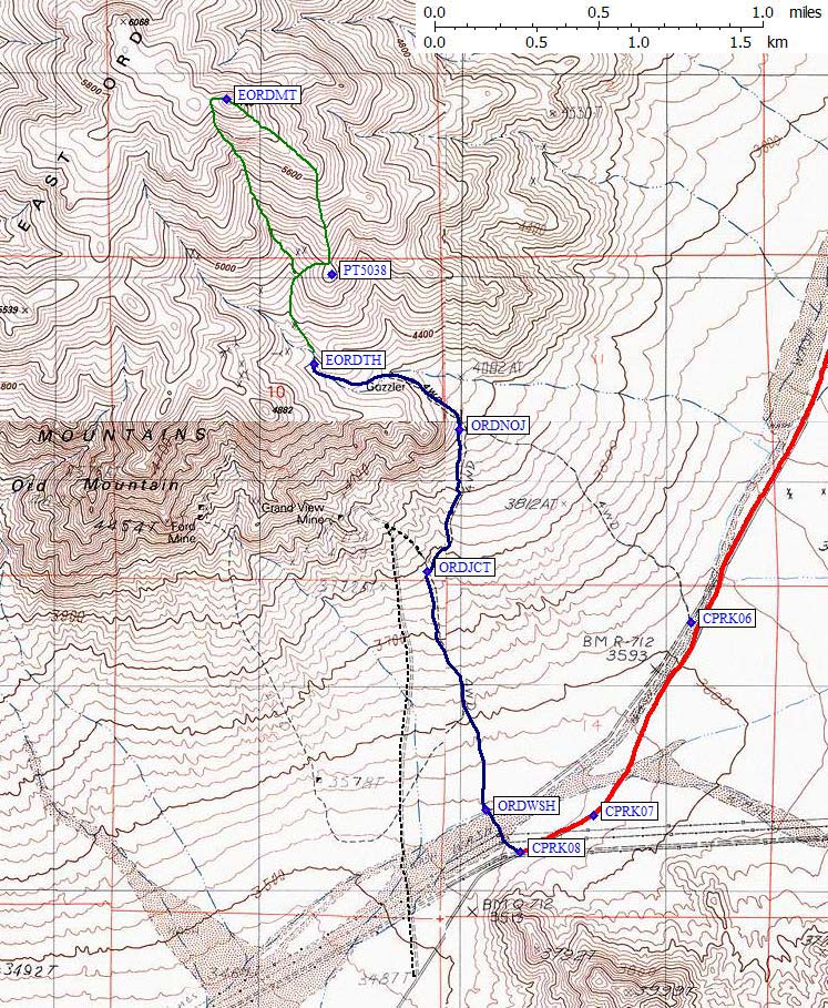 Go 0.2 miles from the main road, northwest across the wash to waypoint ORDWSH. The track turns more north and gets steeper after the wash. Just under a mile from Camp Rock Rd you bear right at the only fork we saw (waypoint ORDJCT). Later there's a wooden post in ground (waypoint ORDNOJ), but the junction shown there on the USGS maps seems not to exist. Beyond this post the road is not suitable for 2WD, even with high clearance (too steep and rocky). The crushed rock (mine tailings) is very loose near the end, and even in 4WD we were slightly sinking and spinning. We drove past my best guess at where the DPS Guide shows the trailhead, to where the road turns up sharply and has clearance problems with huge rocks in the road. Two miles from the main road, there's a place to park half a dozen trucks (waypoint EORDTH).
