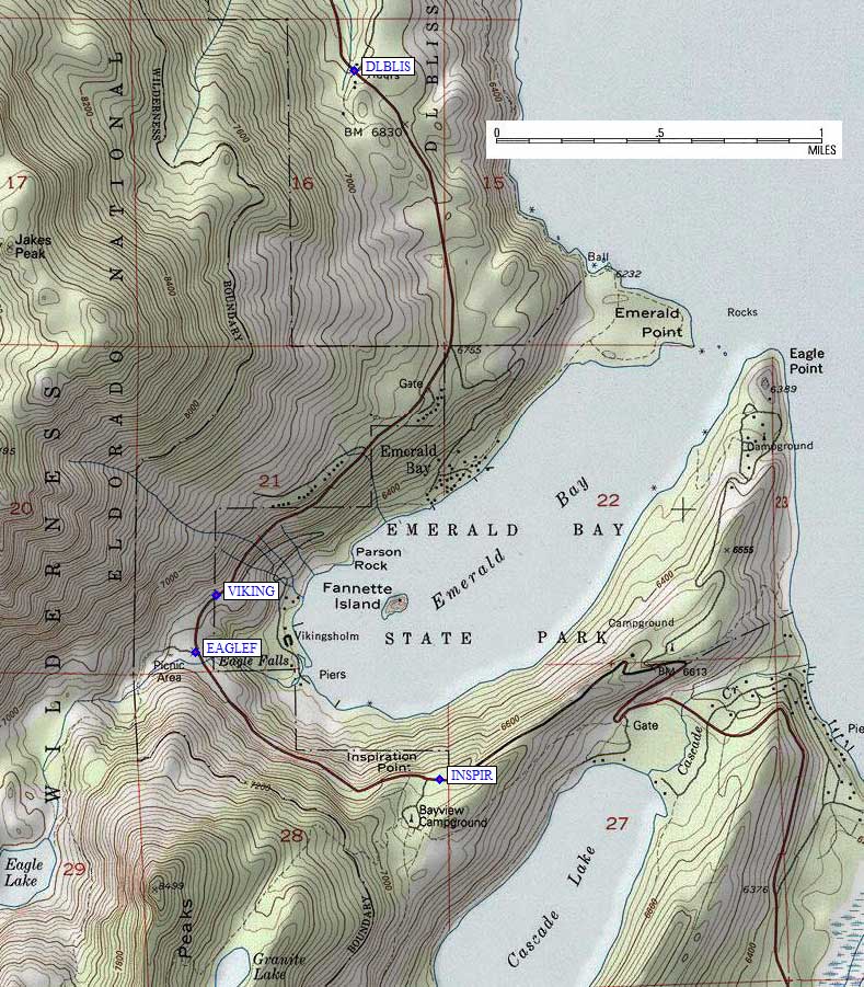 D L Bliss State Park, Inspiration Point, and Eagle Creek (or Eagle Falls) are on the southwest corner of Lake Tahoe, near Emerald Bay. These trailheads cab be used to reach Maggie, Dicks and Jacks Peaks, or the Desolation Wilderness. There is a Forest Service Visitor Center (waypoint VISCTR) for wilderness permits, but it's only open in the summer even though permits are technically required year round. The center is just over 3 miles northwest of where Hwy 89 and Hwy 50 split (50 goes up the east short of Lake Tahoe, 89 goes up the west shore). The strip of Hwy 89 just south of Inspiration Point is on an impressive knife-edge ridge that may be icy and treacherous when the rest of the road is reasonable.
