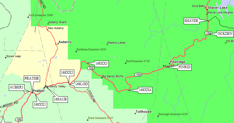 one of two places where Auberry Road intersects Hwy 168.