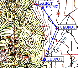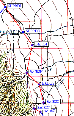 This route does entail crossing both forks of Bairs Creek (waypoints BAIRSN and BAIRSC),