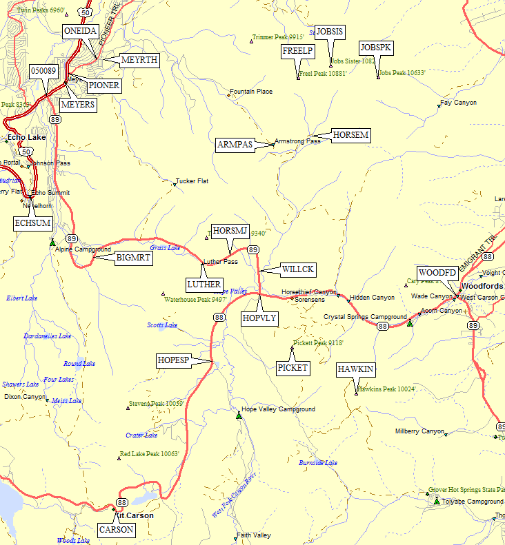 Note that Luther Pass (waypoint LUTHER) and the Big Meadow trailhead for the Tahoe Rim Trail (waypoint BIGMRT) are summer-only parking areas! Both are signed strictly no parking in the winter, and vehicles blocking snow plows will be towed. I'm not sure if you'll be towed when they're not plowing, but I wouldn't risk it!