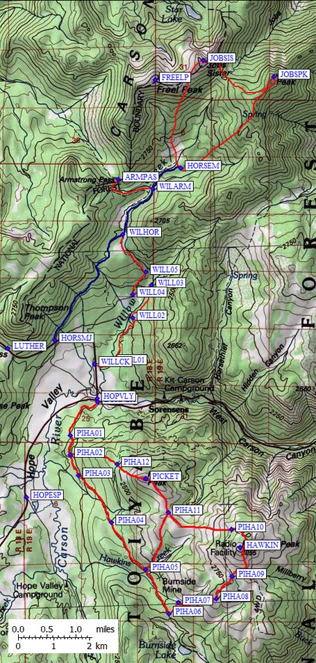 Hope Valley is south-southeast from Lake Tahoe (over Luther Pass), near the intersection of Hwy 88 and Hwy 89 (HOPVLY). The trailhead south of the winter parking lot is usually used for day trips to minor peaks like Hawkins and Pickett but you could walk all the way to Grover Hot Springs. Freel, Jobs, and Jobs Sister can all be reached from the winter parking area as an overnight trip, or from the end of a dirt road as dayhikes.