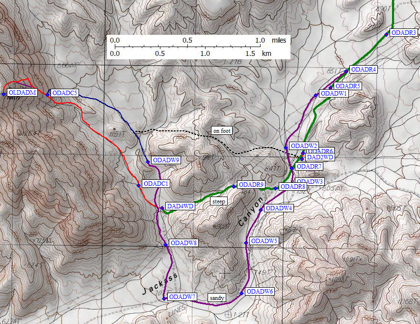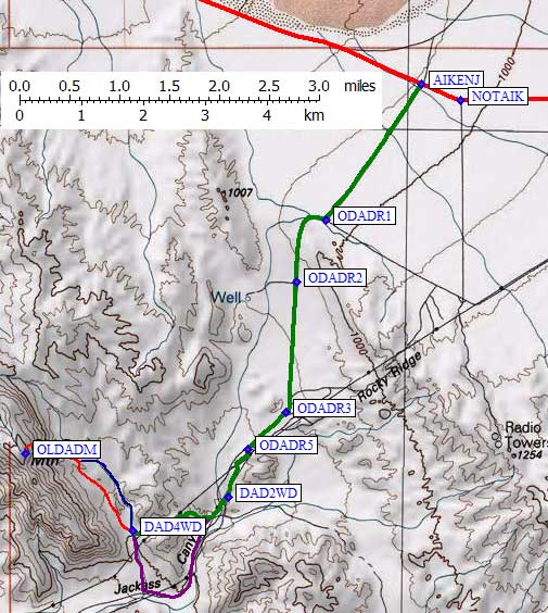 Due south of Point 847 there is a junction where you turn right and go over a small saddle (waypoint ODADR8, 5.3 miles from the pavement). You can instead continue south in the wash as per the DPS GUide (purple line on my map, which Matt Hengst drove but I have not done). I'd suggest NOT staying in the soft sandy wash any longer than you have to! Matt Hengst reports that he didn't see the (green-line) road in 2013, and if you have a light 4WD (like his Rav4) or wide tires there's no problem continuing south in the wash (waypoint ODADW4) shown as a purple line that stays in Jackass Canyon and turns north near waypoint ODADW7. Matt reports that this northerly section is just a wash and not a road, so be prepared to hunt around for the best route depending on what happened with the latest seasonal storm.