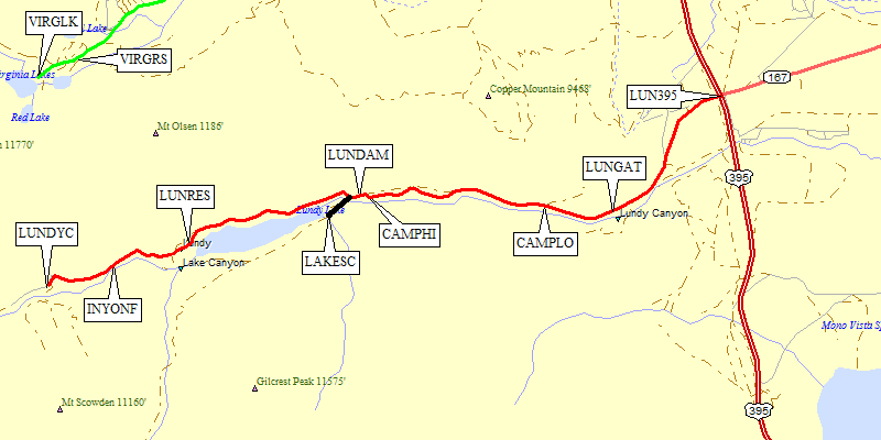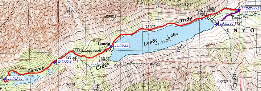 Take Hwy 395 about 8 miles north of Lee Vining, at the base of the southern Conway Summit grade. Turn west at waypoint LUN395 on the well-signed and paved Lundy Lake Road (where Hwy 167 goes east from Hwy 395). As you drive up the canyon, there is a mile-long Lundy Campground between waypoints CAMPLO and CAMPHI. Small pullouts are day use only, campsites require a fee.