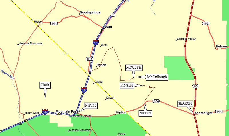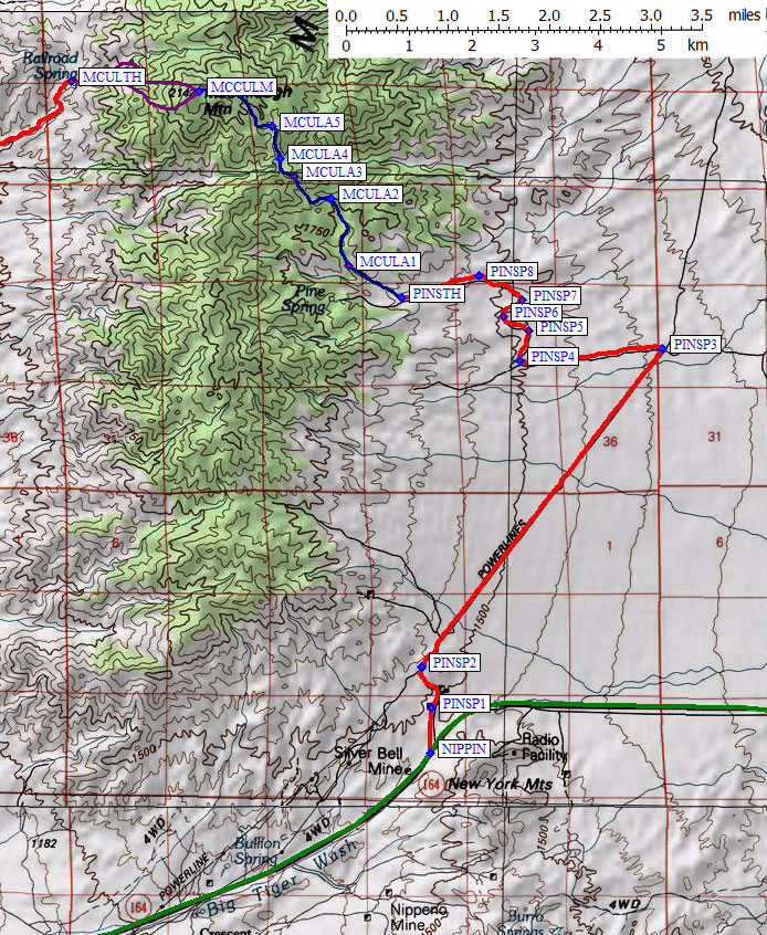 Hwy 164 through Nipton connects I-15 near the state line waypoint NIPT15) to Searchlight in Nevada (waypoint SEARCH). Just west of the highpoint of Hwy 164 is a dirt road (waypoint NIPPIN) leading to a powerline access road. The access road descends into upper Piute Valley to reach the Pine Spring drainage.
