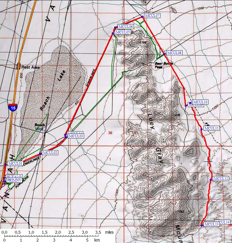 Go straight along the powerline, northeast on the red GPS track log, between Roach Lake (dry) and the Lucy Gray Mountains. As you approach the mountains to your right (waypoint MCUL05, 7.5 mi from the fwy) you may see several side roads. Ignore them. Go straight until the powerline bends to the right (waypoint MCUL06, 7.8 mi from the fwy) and follow it around the end of the range until you hit a good road going southeast (waypoint MCUL07, 8.8 mi from the fwy). Don't turn too soon! The green lines here all work and are fairly good roads, but the red line is way better.