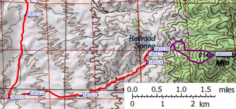 At waypoint MCUL14 (18.3 mi from the fwy) there is a fork you need to pay attention to only on the way out, when you'll stay right. At waypoint MCUL17 (21.4 mi from the fwy) the wash is completely blocked by boulder. You can drive up on the left, then cross and go up on right, then drop back into the wash... or you can just park and walk the wash. This is only about a tenth mile from the absolute end of the road, and if you drive all the way to the end you'll actually have to drop a bit to begin the climb. I'd recommend parking down at MCUL17 to avoid scratches on your vehicle. (You will get some further down, but they'll be heavier here!)