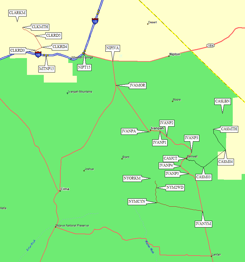 5 miles east of Mountain Pass there is an exit for Nipton Road (waypoint NIPT15), as the freeway turns north and continues to drop. Exit and go east to Ivanpah Road (waypoint NIPIVA, 3.4 mi from I-15), which is marked with both a yellow intersection sign and green street signs. Turn right (south) and follow Ivanpah Road past Morning Star Line Rd (waypoint IVAMOR, 6.6 mi from I-15) and southeast to railroad tracks and a powerline (waypoint IVANPA, 13 mi from I-15). The road turns left (east), then bends southeast again (waypoint IVANP1) before the pavement ends (waypoint IVANP2, 15.4 miles from the freeway).