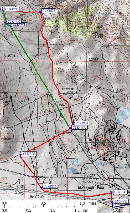 Exit I-15 at Bailey Road for Mountain Pass (waypoint MTNP15) and go north on Bailey to Clark Mtn Road (a frontage road parallel to I-15). Between the freeway and the frontage road there's a shoulder where the CHP said we could leave cars for the day. Turn west on Clark Mtn Road (waypoint CLKRD1) and follow the freeway west for a mile.