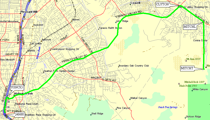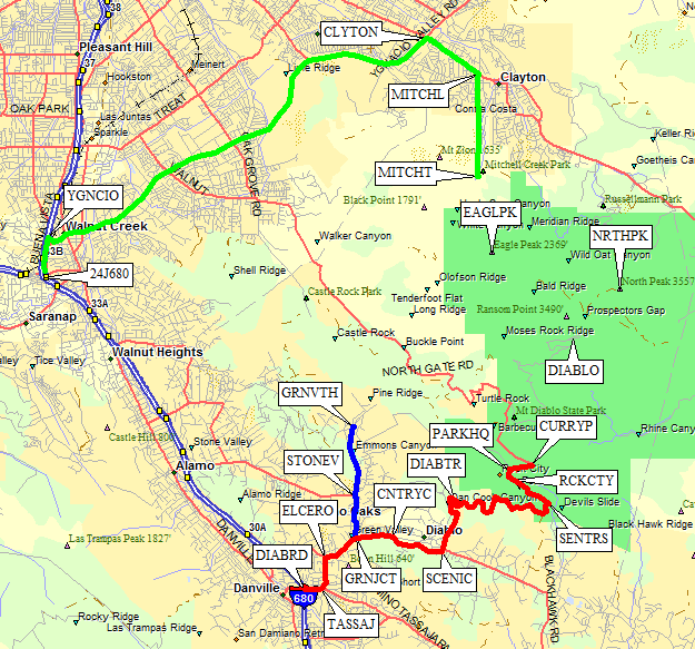 Get across to 680 and take the Ygnacio Valley Road exit (waypoint YGNACIO) one exit north of Highway 24 (waypoint 24J680). Follow Ygnacio Valley Road into the town of Clayton, then make a right on Clayton Road (waypoint CLYTON). Make your next right south onto Mitchell Canyon Road (waypoint MITCHL). At the south end of Mitchell Canyon Road is a trailhead (waypoint MITCHT) near the ranger station. You'll probably have to pay for parking.