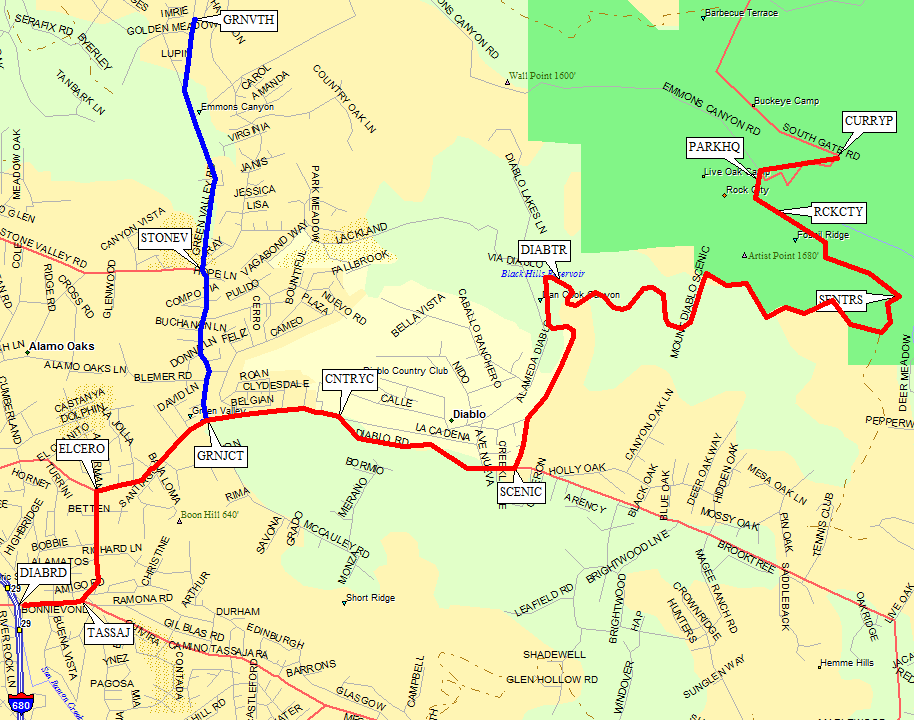 Get on I-680 about halfway between I-580 and Hwy 24, and take the Diablo Road exit (waypoint DIABRD). This road turns left and then right (at waypoints TASSAJ and ELCERO) - don't be fooled into going straight on Tassajara or El Cerro or Ackerman: follow the signs for Diablo even though it looks like you're turning onto something else.