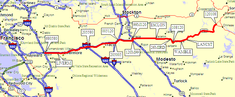 There are three GPS routes in this file: The first route (OAKDALE NORMAL) represents the best choice for light traffic days. It is 19 miles shorter than the MACRO BYPASS route but may be faster when Tracy, Escalon, and Oakdale have stop-and-go traffic. The second rout (OAKDALE BYPASS) just gets you around the town of Oakdale, using Rodden Road to the north. The third route (MACRO BYPASS) winds around farm roads to avoid most towns, skirting south of Oakland and Tracy, and skirting north of Modesto.