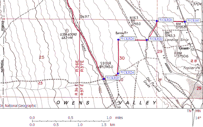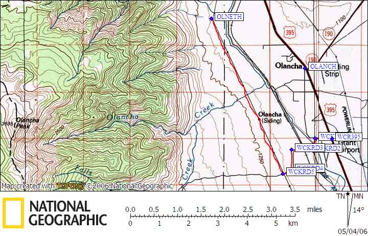 From the town of Grant just South of Olancha (if you reach Olancha, you're too far north), turn west off Highway 395 onto the unpaved, signed "Walker Creek Road" (waypoint WCR395, 0.0 mi). The first mile skirts jaggedly rectilinear property boundaries. You quickly branch Southwest (waypoint WCKRD1, 0.3 mi), cross the aqueduct on a narrow bridge and fork west (waypoint WCKRD2, 0.6 mi). Stay on Walker Creek Rd across a railroad track, pass a spur road, turn South (waypoint WCKRD3, 1.0 mi), later West at a junction (waypoint WCKRD4, 1.5 mi), then Northwest (waypoint WCKRD5, 1.7 mi) to follow the road right under, and parallel to, the powerlines (which might be Fall Road according to some maps, but there's no road sign at the intersection). Follow this road until the point where the lines and the road turn north-northeast in unison (waypoint OLNETH, 5.5 mi). Pull off the road and park (at about 3900 feet elevation).