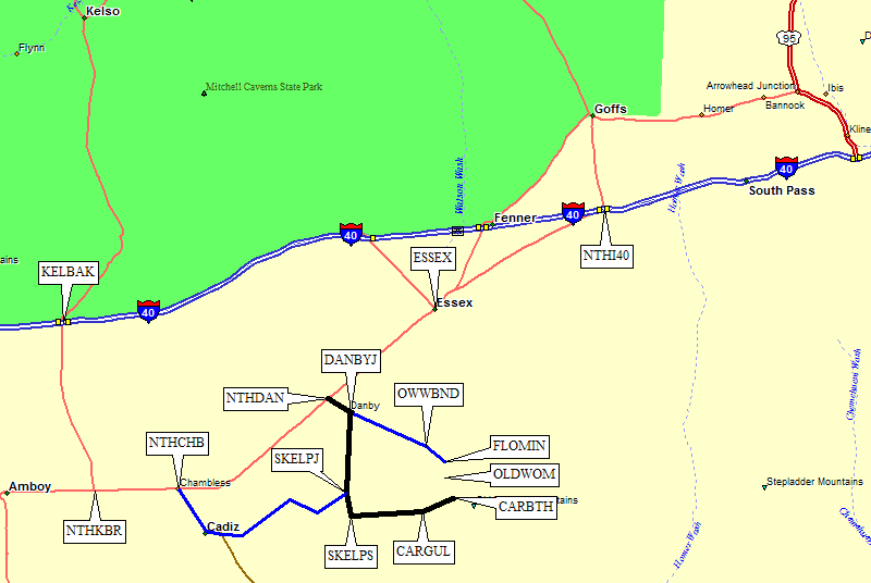 From the west, like coastal CA, leave I-40 at Kelbaker Road (waypoint KELBAK) and go south to the National Trails Highway (waypoint NTHKBR). Follow that pavement east and then northeast to the signed Danby turnoff (waypoint NTHDAN). There is a DPS Guide route through Cadiz, shown in blue on the map, but I haven't personally driven it and I'm betting this route has better roads.