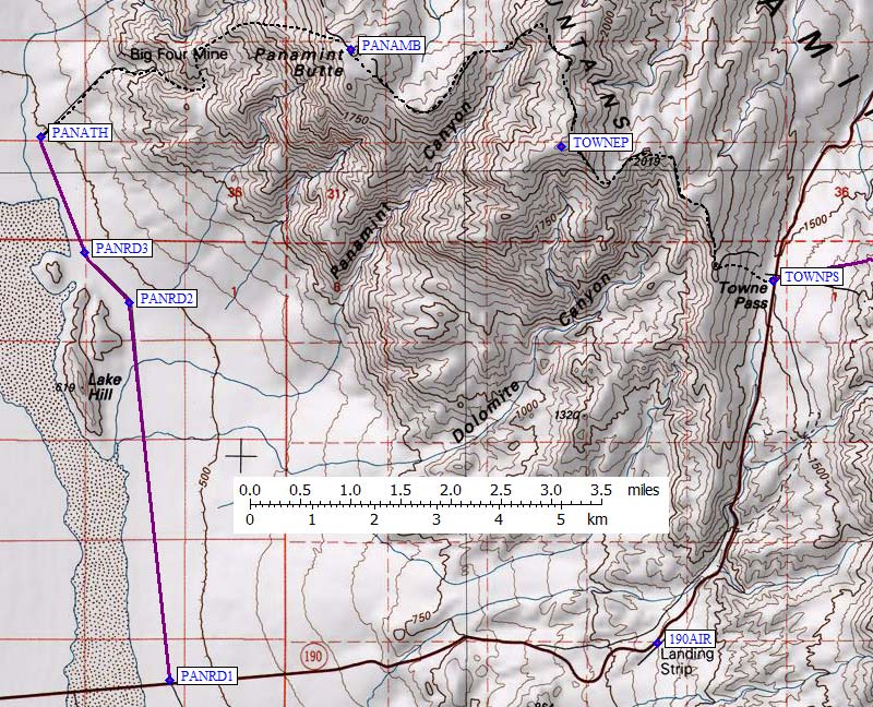 Hwy 190 to an unmarked dirt road (waypoint PANRD1). This road is right where a yellow