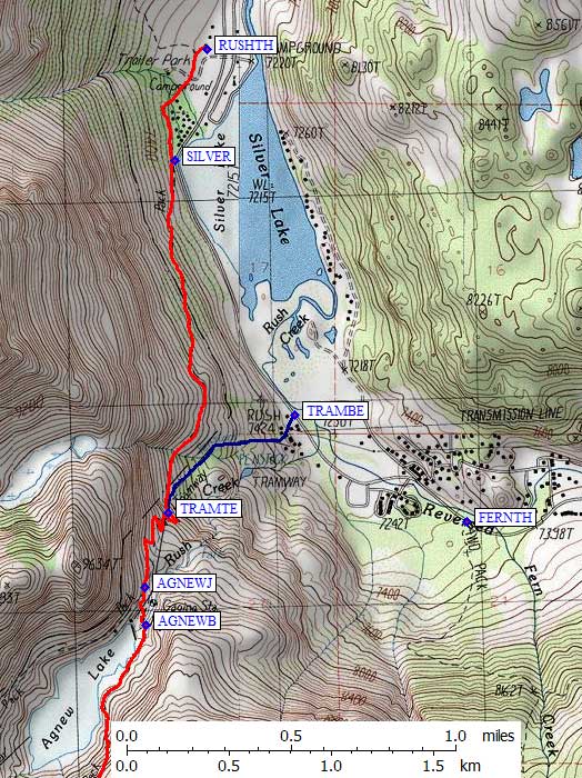 If you're headed for Agnew Pass, Thousand Island Lake, etc, look for steel stairs leading down from the tram to a small building. Ignore the building and any use trails, head for the huge pipeline between you and the lake. Once you cross the pipeline (partially buried) you should be able to see the footbridge across the outlet stream (waypoint AGNEWB). That's where the trail starts around the east shore of Agnew Lake. It's not well maintained, and there are lots of use trails, but don't climb too far above the lake until you've walked around the shoulder and can see the bowl south of the lake.