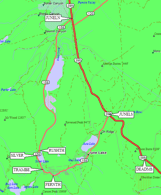 just north of Mammoth Lakes. Leave Hwy 395 at waypoint JUNELN or JUNELS