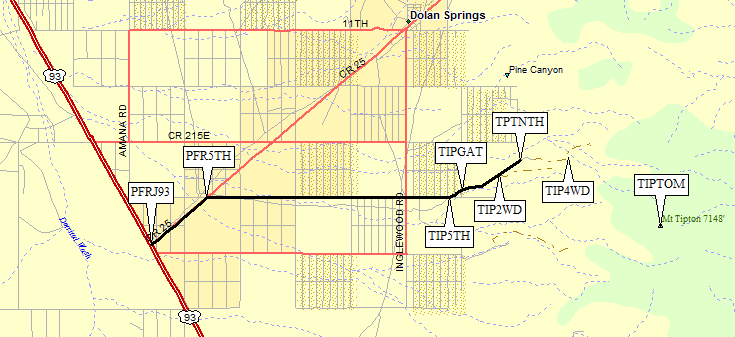 There is a small town on Hwy 93, called Dolan Springs, about 30 miles north of Kingman and about 40 miles south of Hoover Dam (near Boulder City). Leave Hwy 93 by turning northeast on Pierce Ferry Road (waypoint PFRJ93). This paved road is marked by a green street sign, and you'll see Dolan Springs signs also. In about one and a third miles, turn right on a tiny dirt road with a tiny green road sign saying 5th Street (waypoint PFR5TH). It's easy to miss this one. We thought it was a driveway at first.