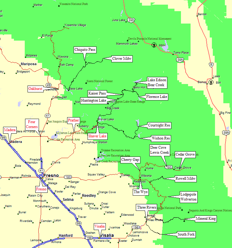 Fresno and Madera area to Oakhurst, Shaver, The Wye Pacheco Pass (Hwy 152) from Hwy 101 to Hwy 99 Visalia to Three Rivers (Hwy 198)