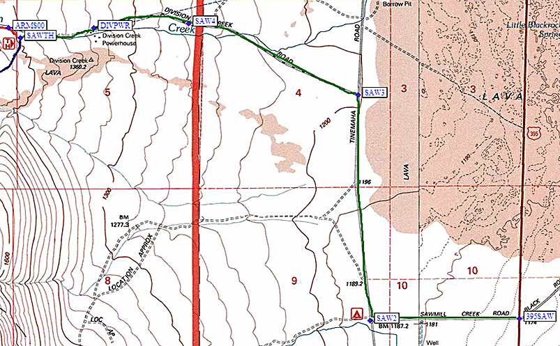 Follow Black Rock Springs Road (the green line on the map above, which is called Sawmill Creek Road on some maps) from US-395 (waypoint 395SAW) due west to a 'T' intersection with Tinemaha Road (waypoint SAW2). Turn right (north) at the 'T' and then turn left (west again) at Division Creek Road (waypoint SAW3) where a brown sign points you to the 'Sawmill Pass Trail'. Stay on this road as it goes west-northwest through waypoint SAW4 (not a junction, just west of a cattle guard) and then west to the powerhouse at waypoint DIVPWR (where the pavement ends). Unless you're meeting people at the powerhouse, continue to the Sawmill Pass trailhead at waypoint SAWTH. (On the map below, the trail to Sawmill Pass is the blue line that goes southwest from SAWTH, and the road to Armstrong is the red line making a right turn to the northwest at SAWTH.)