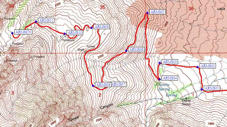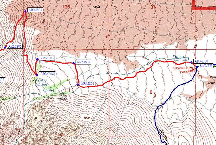 If you're headed for Armstrong Canyon, continue northwest past the Sawmill trailhead to waypoint ARMS00 and then southwest to waypoint ARMS01 (the red line on the map above). If you go west-southwest at ARMS01 you wind up in Spook Canyon, a trail-less winter route. Most people will turn right (north) and follow road 12S01 to waypoint ARMS02 and then west to waypoint ARMS03 (the passenger car trailhead for Armstrong Canyon). There is a nice campsite in the trees here, but it is NOT the place marked Scotty Spring on the map, even though people often say they are starting from the spring.