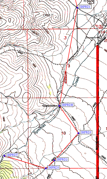 Turn right at the SHPRD1 fork where the road becomes very winding and you should ignore side roads, turn hard left at SHPRDH just BEFORE the sign for Symmes Creek. Waypoint SHPRDH is at the horse trailhead, and you can park your car here if the road ahead gets too rough. This part of the road was apparently graded in 2009, so old instructions to turn AFTER the sign put you on a worse road.