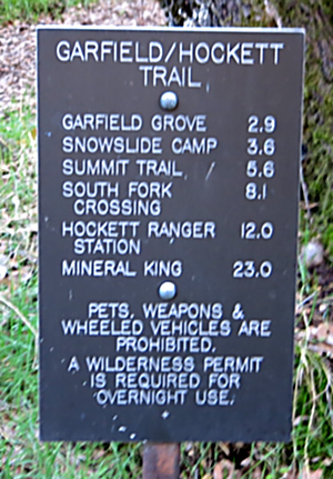 A few yards past the last campsite is the end of the road and trailhead parking (waypoint SFORKP). There is another large bear box here and non-potable water for horses, but no other facilities. (It's a bit of a walk to the campground outhouse.) The Ladybug Trail crosses the river on a bridge, where you can scramble down to running water, and can be used to reach Homer's Nose. The Garfield-Hockett trail leaves the south side of the road just down-canyon from the parking area, and can be used to climb Dennison Mtn as a day hike or to reach Hockett Meadow for climbing Vandever or Homer's Nose. |