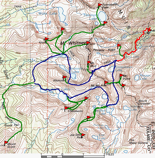 From Arc Pass, 4 of us headed down to the cars the same day. Bob, Jim, and Eddie headed up to Mallory and Irvine (planning to do Thor on the way out the next day) while Craig and I blew out to the cars at top speed leaving Aaron and Tim free to walk at a more relaxed pace. Craig dropped me off at the Horseshoe Meadow trailhead for a Sunday dayhike of Muah, then returned to ride home with Tim and Aaron. Sunday I bagged Muah and hitched a ride back to Whitney Portal just as the others were hiking out.