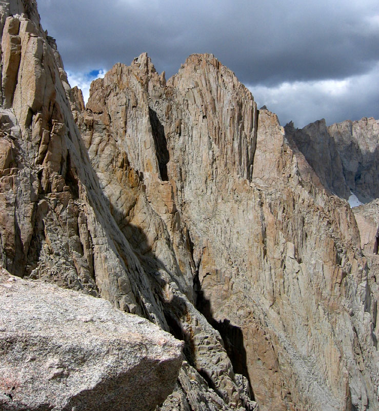 Secor also talks about going under a huge chockstone, but we didn't see that either. Then there's the "much loose rock" warning, but we didn't think it was bad at all. Perhaps we weren't on the described route, in which case ours was better! Page 46 of Secor's book seems to show a line left our chute, but I can't be sure. We just climbed straight up the same chute until within 50' of the saddle north of Corcoran, then angled right below a face (now 300' below the summit), and climbed Class 2-3 straight to the summit. No tricks. No dangerous loose rocks.