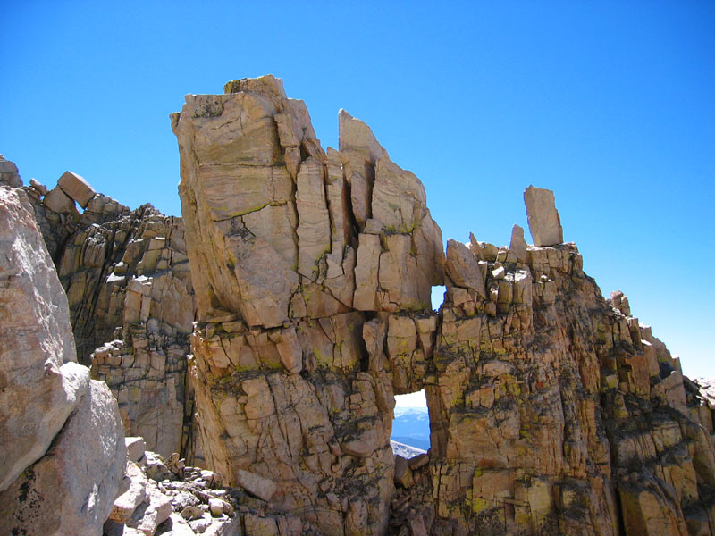 Returning to the notch, we took the standard 3rd class route over to Arc Pass - it's easier going UP that "breathtaking" face than DOWN it! (Somehow the description of the middle peak never matches the mountain. We never found a tunnel that seemed right, but it's not worth much time thinking about - just go for the high point of the middle peak and it will all be obvious. The "breathtaking" face left us slightly right of the middle summit from the notch, then we went almost directly to the middle summit on its west ridge. Going in the other direction, get around to the west side of the middle summit, go down to a tilted slabby area overlooking the notch, and look for decent holds on the sheer cliff down to the notch.)