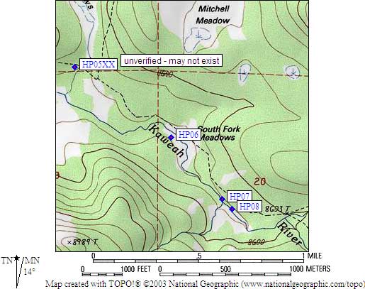 - Note: You must cross stream to get to a large horse campsite from the trail.