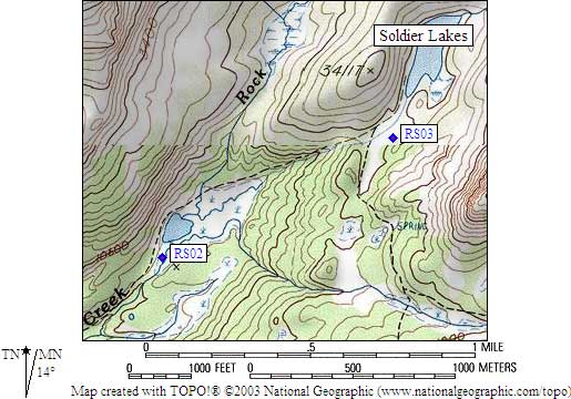 Guide books call Lake 10400 'Upper Rock Creek Lake' because Rock Creek flows through it. It is not named on the USGS maps, and there do not appear to be any references to 'Lower Rock Creek Lake' despite the wording from the Rangers. It is southeast of Joe Devel Peak and southwest of The Major General.