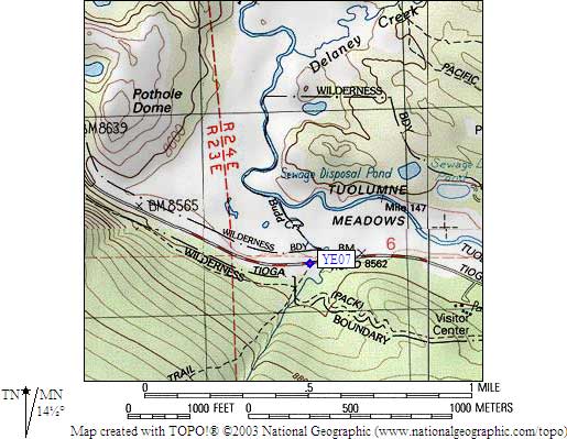 (lat,lon) = (37.8733800, -119.3825700) in decimal degrees, NAD83.