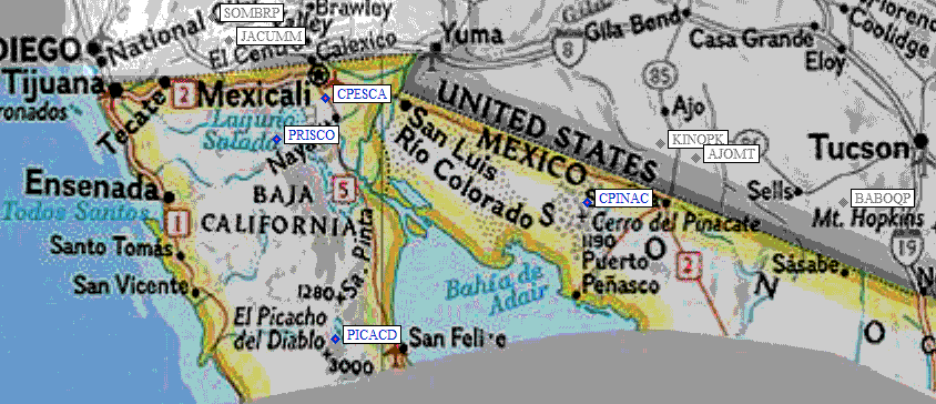 | Cerro Pescadores is the DPS name for the point in the Sierra Cucapa at 32°20’N, 115°21.7’W, about 20 miles south of Mexicali. It is 1.5 km SE of benchmark Puerta. | ||||||||||||||