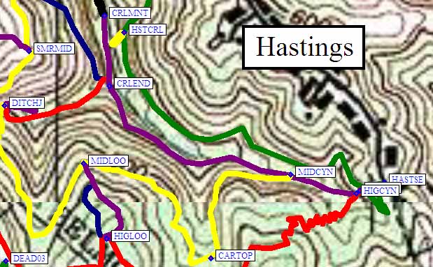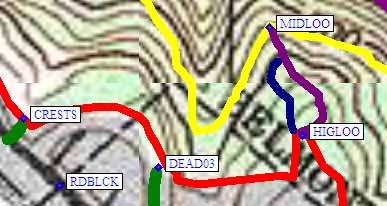 Connects the High Trail (at waypoint MIDHIG, just south of Dam Trail) to the Canyon Trail (at waypoint MIDCYN, just west of where the Canyon Trail intersects that High Trail).