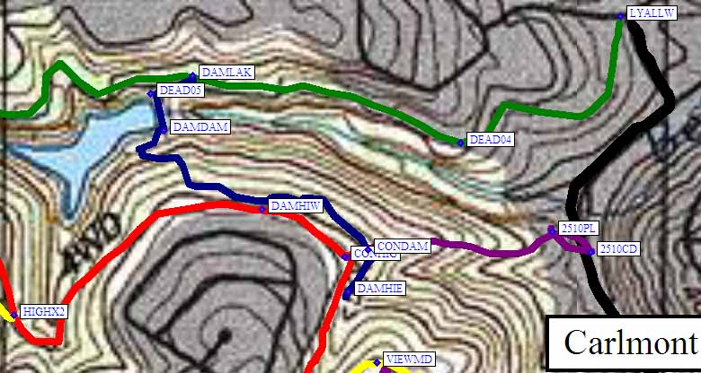 Connects the Lake Trail (at waypoint DAMLAK) and the High Trail (at waypoints DAMHIE or DAMHIW) by going across the dam (waypoint DAMDAM) at the east end of Water Dog Lake.