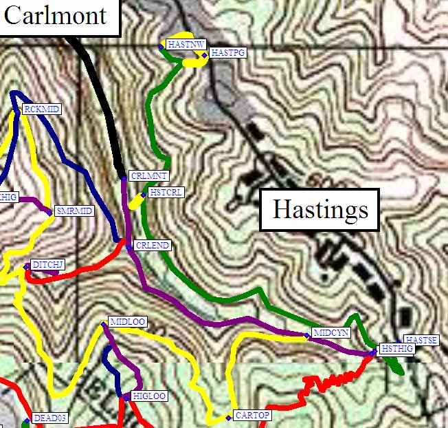 This is a fire-road-width trail from the end of short side-road Ridgewood Ct (waypoint HASTNW) or a tiny playground (waypoint HASTPG) down to Carlmont Trailhead (waypoint CRLEND, just up-canyon from the parking lot at waypoint CRLMNT), or down and up to High Trail (waypoint HIGCYN), or all the way back up to an unmarked access point on Hastings (waypoint HASTSE, near a large electrical box, behind a lamppost).