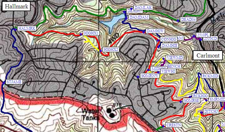 The Hallmark Drive trailhead (waypoint HALMRK) is just south of Ralston, the Lyall Way trailhead (waypoint LYALLW) is also south of Ralston but requires doubling back a bit to the west (at the intersection of Lyall Way and Lake Road). If you turn south off Lyall Way at Lake Road and follow Lake around the corner where it becomes Carlmont Drive, then follow Carlmont to a dead end, you'll find the Carlmont trailhead (waypoint CRLEND). The other entrances are unofficial. Look for them on or near Hastings, Club, Crestview, and Hallmark.