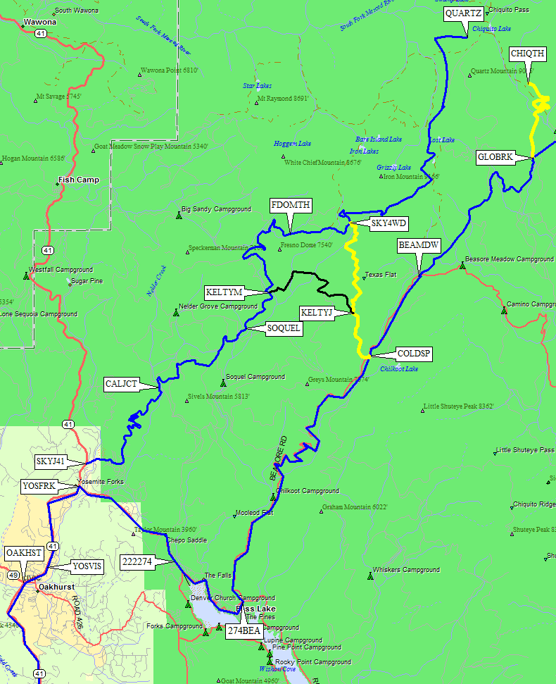 See GPS routes OAKHURST-CHIQUITO, OAKHURST-QUARTZ, and BEASORE TO SKY RANCH.