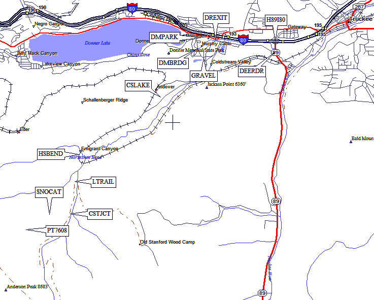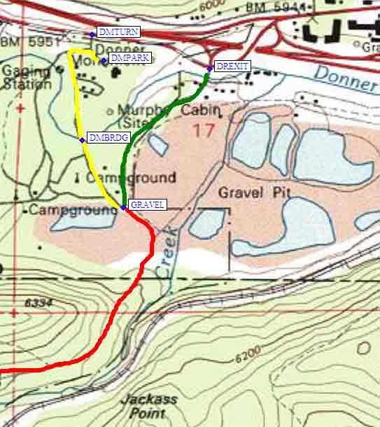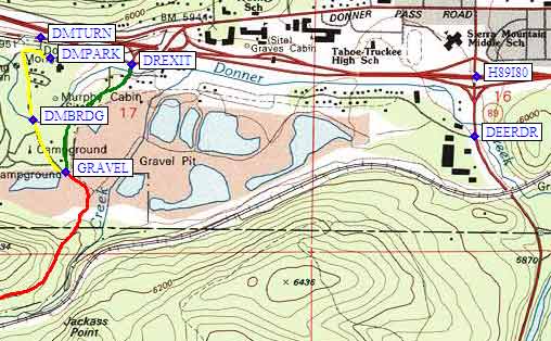 Exit Hwy 80 at the Donner Pass Road exit (where a sign says "Donner State Park") and go south toward the filling stations and Holiday Inn. (The Chevron sells Krispy Kreme donuts, and is open 24 hours!) There's a stop sign at the road which goes west to Donner Lake (waypoint DREXIT), and a nearby sign that says turn right for a Sno-Park, but in fact there is no Sno-Park anywhere near here. Follow the sign and turn west anyway, then turn left (south) at the first driveway (waypoint DMTURN). If you start seeing houses, you've gone to far!