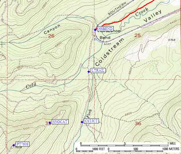 We parked there, at about 6300 feet (just down-canyon from waypoint HSBEND). We crossed Coldstream Creek up on the railroad tracks and began our cross country ascent.