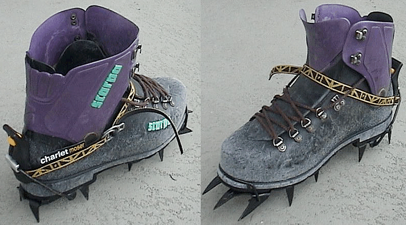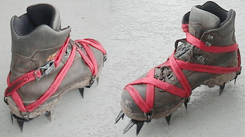 Also shown in the pictures above are my custom (CHEAP) straps holding old flexible Salewa crampons on Asolo 535 general purpose leather boots.