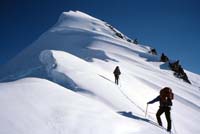 Our route along the ridge proved fairly easy except for two sections that required front-pointing on ice, and several hidden cracks loosely drifted over with soft snow. We used belays in several places, but I did not feel that we really needed them. (Guides must be overly cautious, or they never get very old - Staeheli's partner was afraid of walking on cornices, but died while walking UNDER one.) At the base of the summit mass, however, we found ourselves knee-deep in snow that balled up on our crampons. Under this was a layer of ice in places, all at angles that measured over 40 degrees in places.