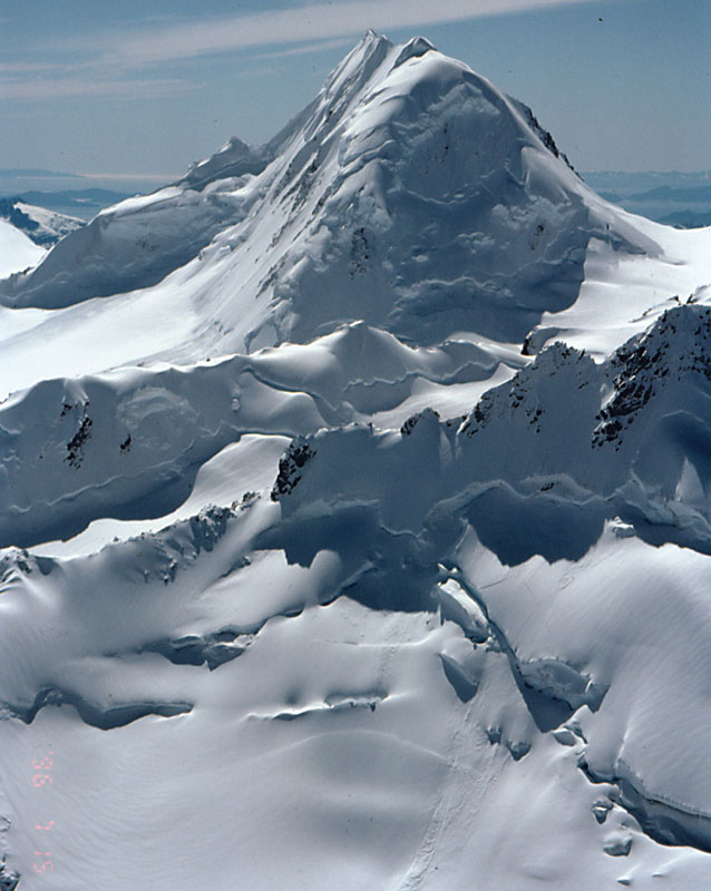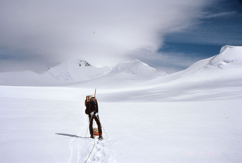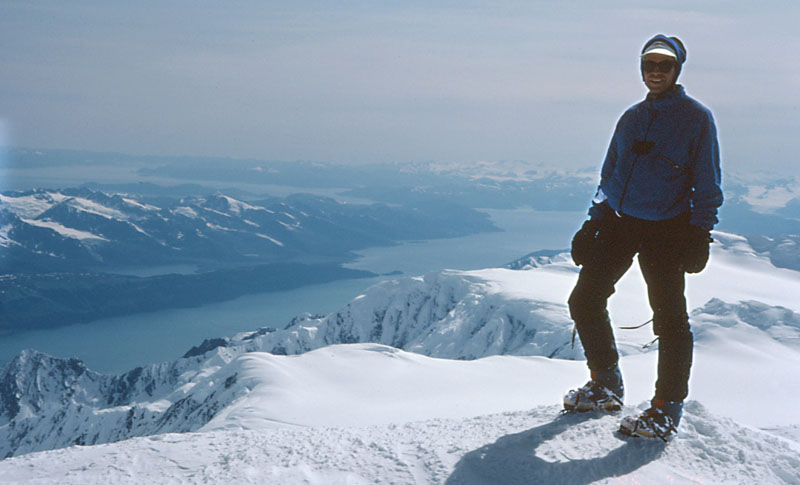 In July 1996, I was back in Anchorage (Alaska) for a high school reunion and decided to take another look at Marcus Baker (the high point of the Chugach Range). This time I had the money to hire a guide, however, which changed the trip dramatically! I did not have to pack food/tent/rope/etc, and the guide knew a pilot who could fly us over the ice fields onto an 8000' snowfield at the base of the summit ridge. Two of us each paid the guide about $600 and the pilot about $300, so this was not a low-budget trip. On the other hand, the guide's knowledge of snow conditions and routes was invaluable. There are no guide books for the Chugach mountains!
