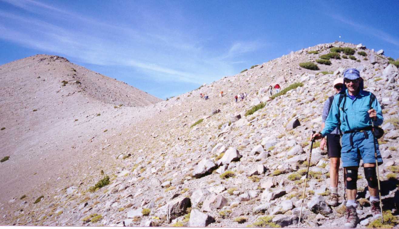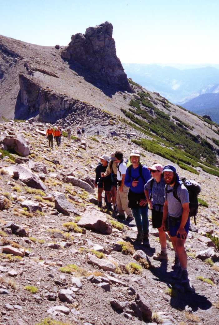 Adventurous and lively discussion continued to be shared by all as we sat there in the balmy shorts-and-sleeves weather. Bruce Trotter, a botanist, gave me a copy of the book he had prepared. I addition to this newest completor, there were four other list finishers including Barbara Sholle, Don Sparks, Steve Eckert, and Rich Gnagy. And others present very close to the finish with only a few peaks remaining -- Greg and Mirna Roach and Pat and Gerry Holleman. As we proceeded back many stopped at Two Teats and walked up the east Teat and/or climbed the short third class section for the west (lower) summit.